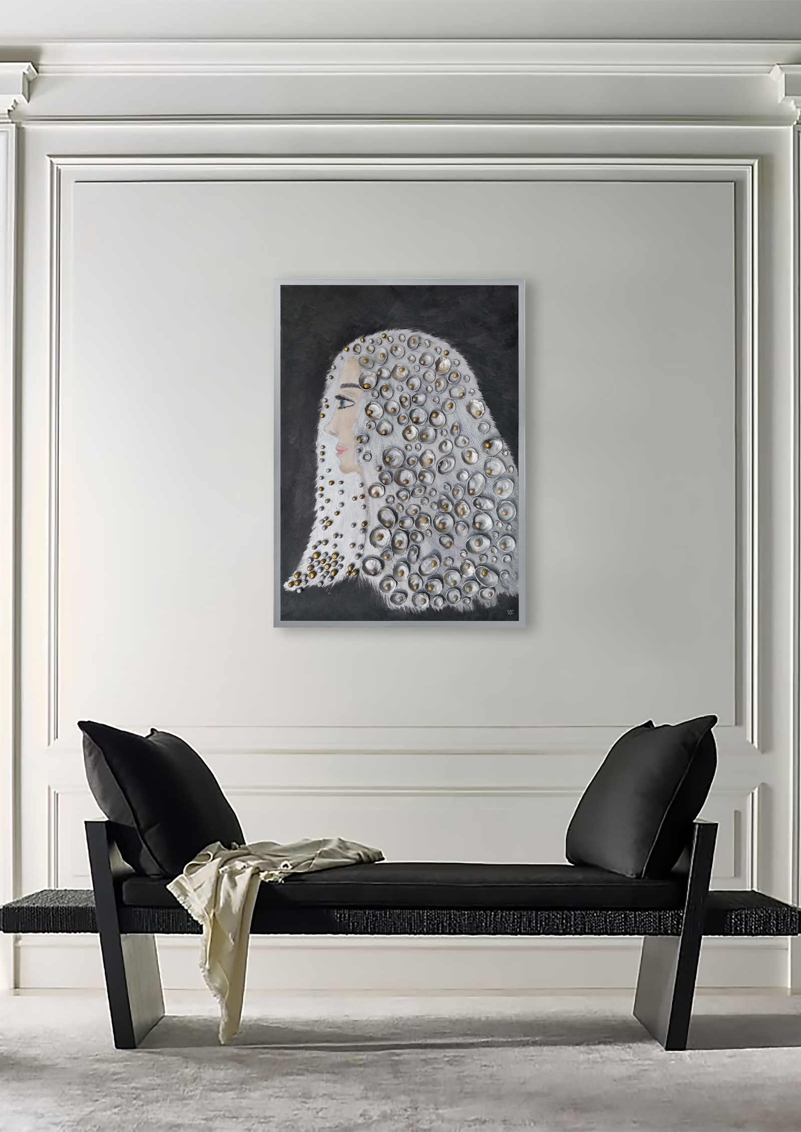 acrylic paint, texture paste, lightweight modulin, golden and silver embellishments on canvas